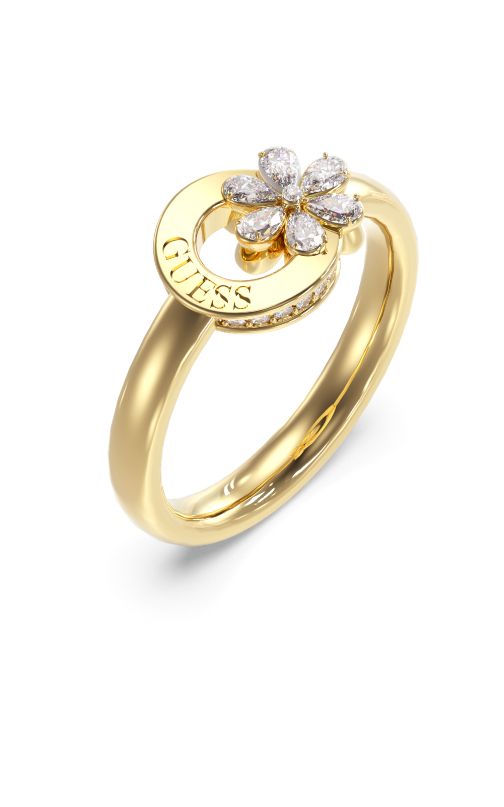 Γυναικείο Δαχτυλίδι Guess STEEL LILY JUBR05109JWYG-No.54 χρυσού χρώματος, με σχέδιο λουλούδι με διαφανείς πέτρες ζιργκόν και λογότυπο.