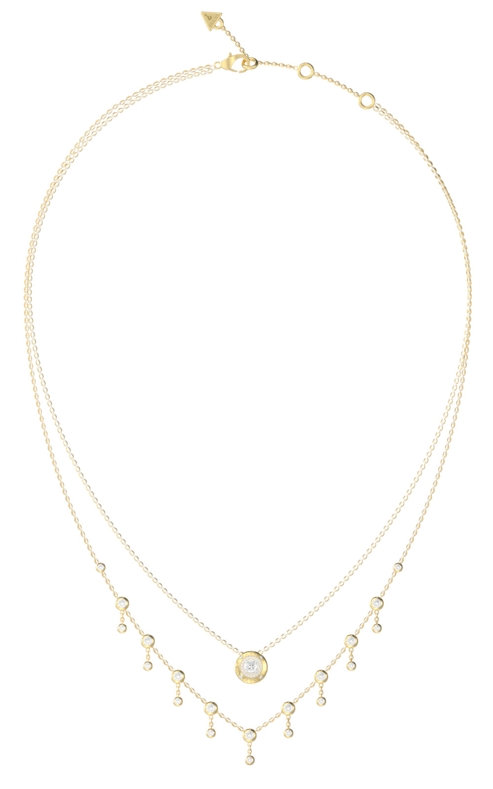 Γυναικείο Κολιέ Guess STEEL SPARKS JUBN06273JWYGT/U χρυσό με διπλή αλυσίδα, με κρεμαστά τσαρμ και σχέδιο με πέτρες