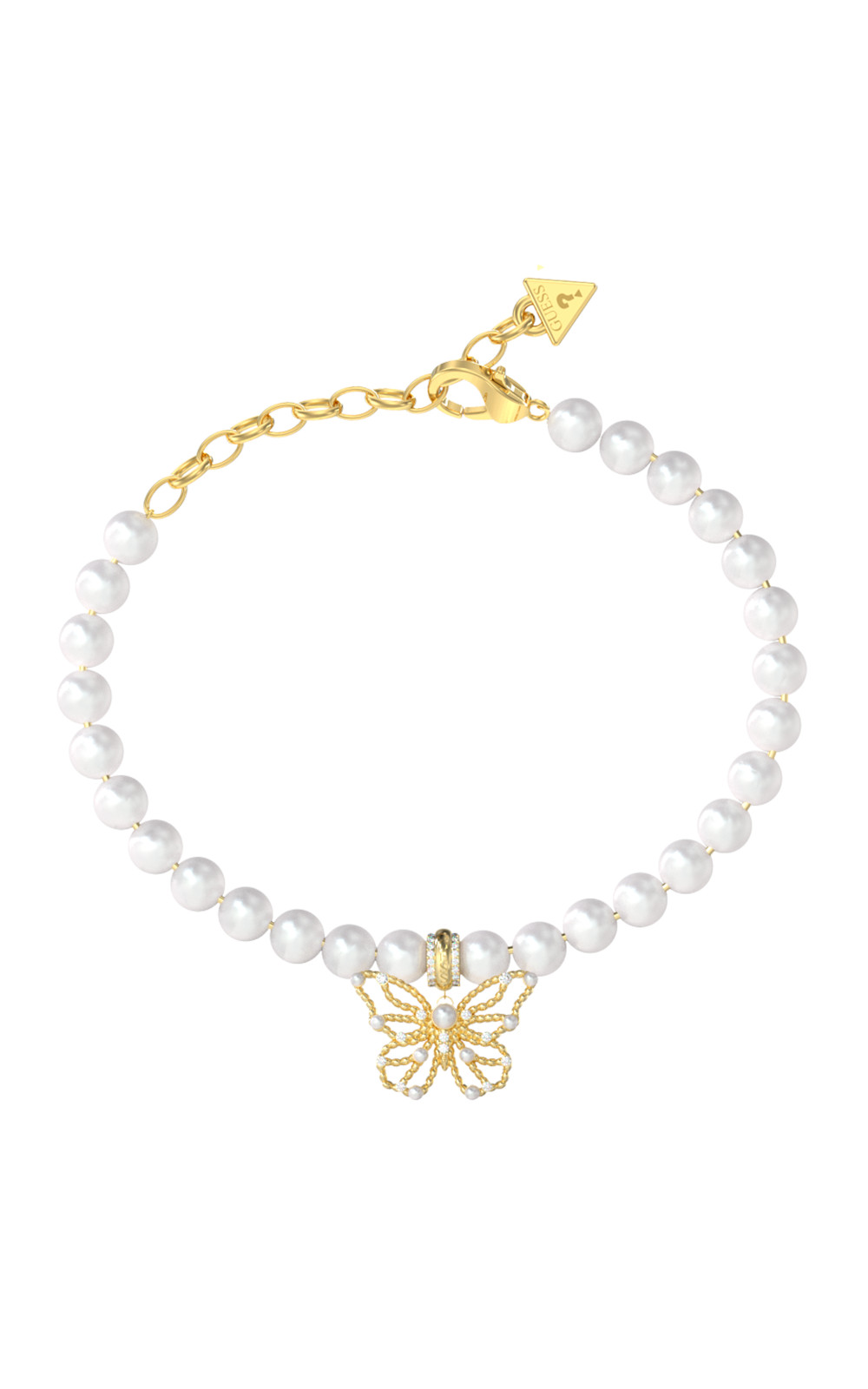 Γυναικείο Βραχιόλι Guess STEEL BORBOLETA JUBB06124JWYGL χρυσού χρώματος με πεταλούδα,άσπρες πέρλες,πέτρες και λογότυπο(21cm).