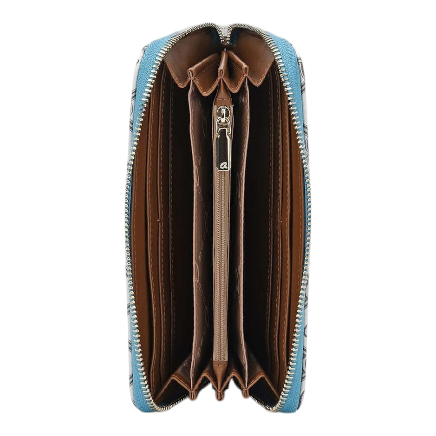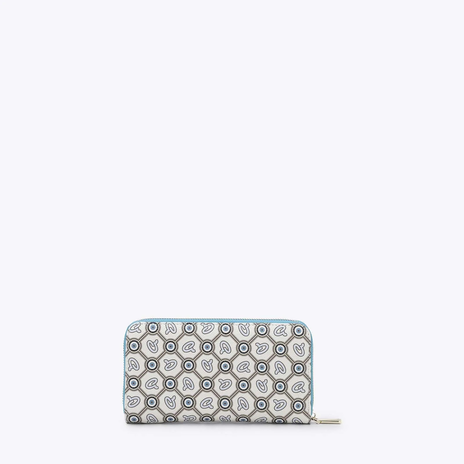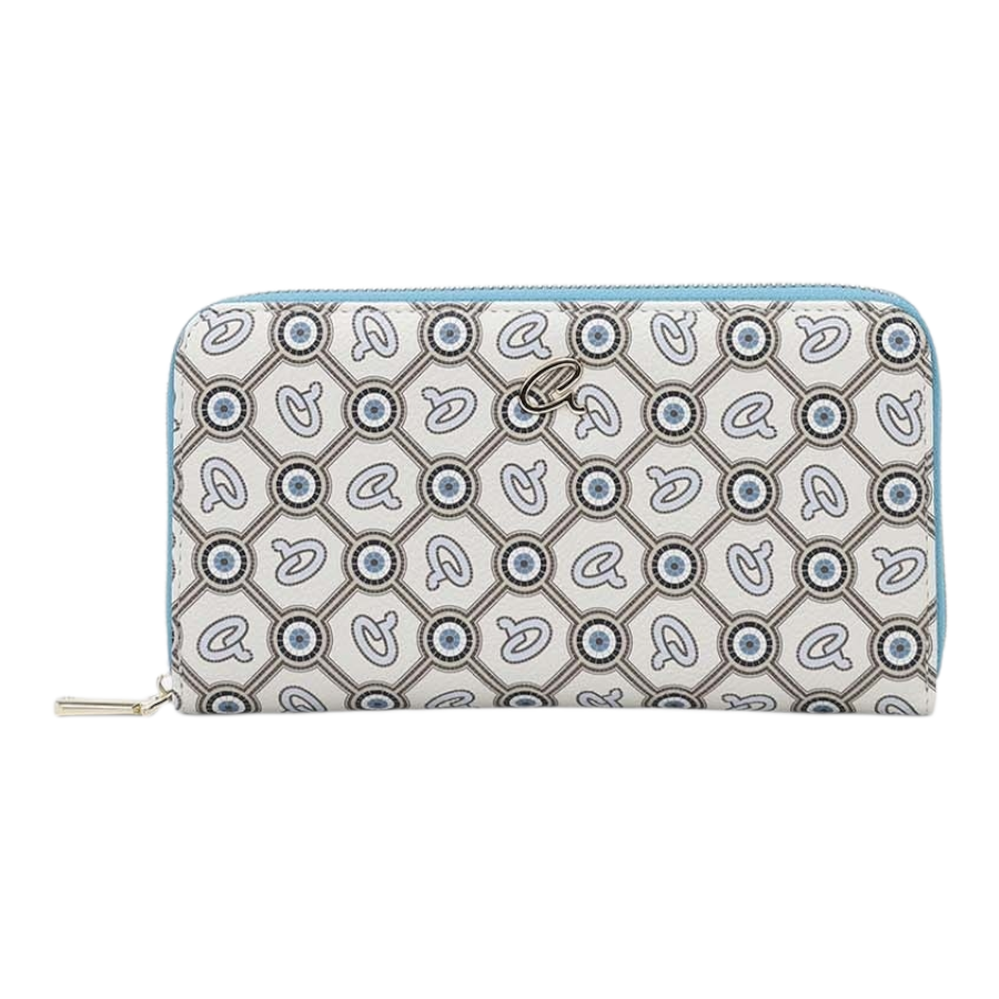 Γυναικείο πορτοφόλι με τύπωμα μάτι, κατασκευασμένο από τεχνόδερμα υψηλής ποιότητας. Διαθέτει κεντρική θήκη με φερμουάρ και θέσεις για κάρτες και χαρτονομίσματα. Κλείνει με φερμουάρ. Μπορεί να συνδυαστεί ιδανικά με την τσάντα 1010-3673