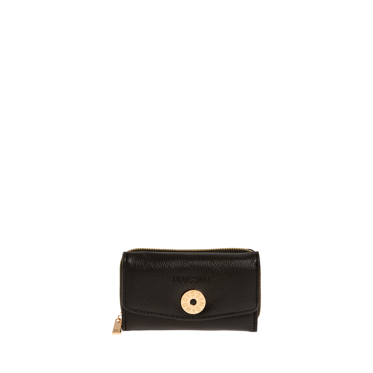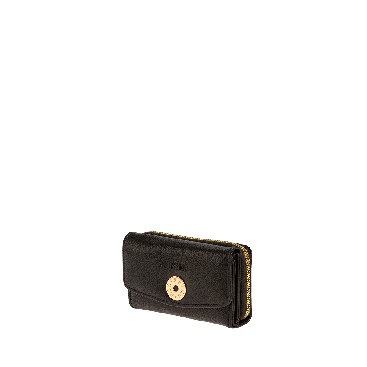 Γυναικείο πορτοφόλι από ανθεκτικό συνθετικό δέρμα. Κλείνει με μεταλλικό μαγνητικό κούμπωμα στο εσωτερικό του υπάρχει θέση για μετρητά, τέσσερις θήκες για κάρτες, δύο επιπλέον θήκες και μια θέση για φωτογραφία. Έχει εξωτερική θέση με φερμουάρ για κέρματα με χώρισμα στην μέση.