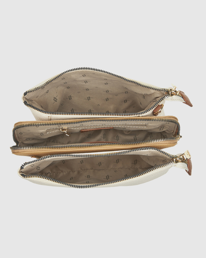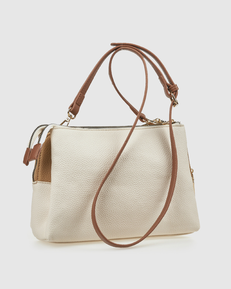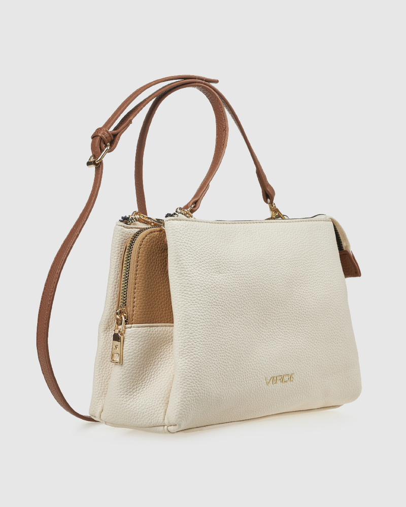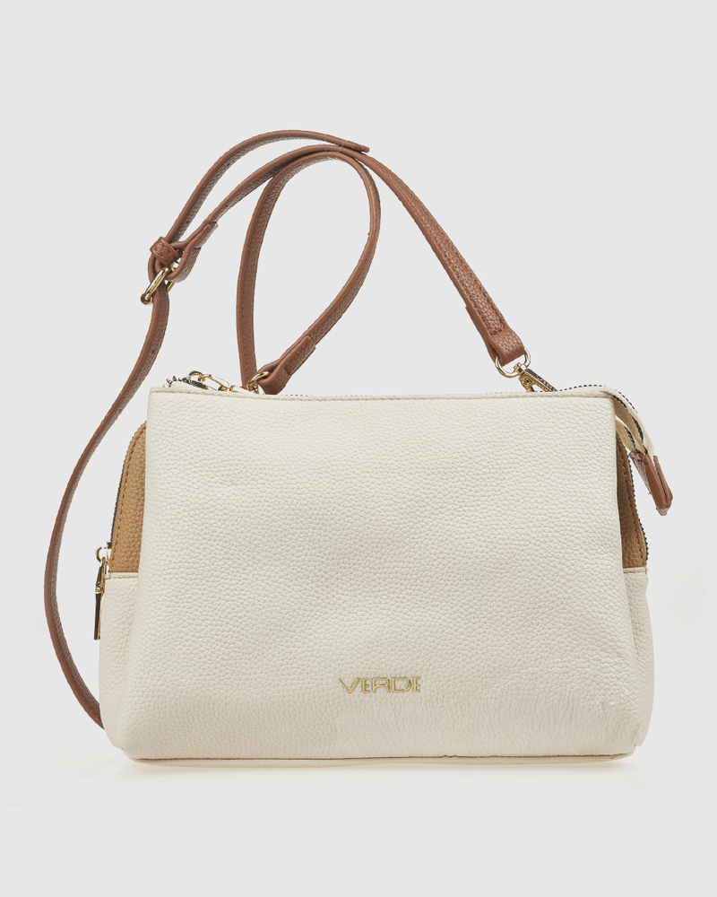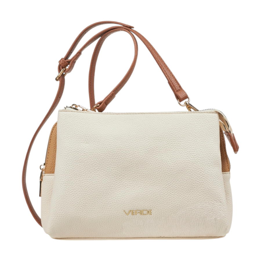 Τσάντα χιαστί από συνθετικό δέρμα με κομψόδιχρωμικό σχεδιασμό. Διαθέτει τρεις κύριες θήκες με φερμουάρ για καλύτερηοργάνωση, καθώς και εσωτερικές θήκες για μικροαντικείμενα. Το ρυθμιζόμενολουράκι ώμου προσφέρει άνεση στη μεταφορά, ενώ τα μεταλλικά στοιχεία σε χρυσότόνο ολοκληρώνουν το κομψό στυλ της και την καθιστούν ιδανική για καθημερινήχρήση. Συνοδεύεταιαπό προστατευτική θήκη.