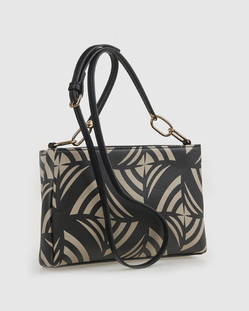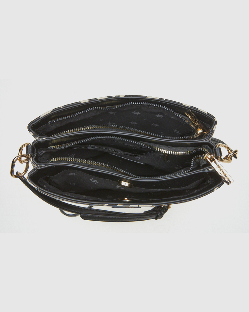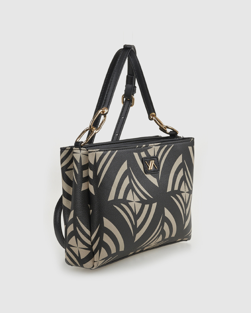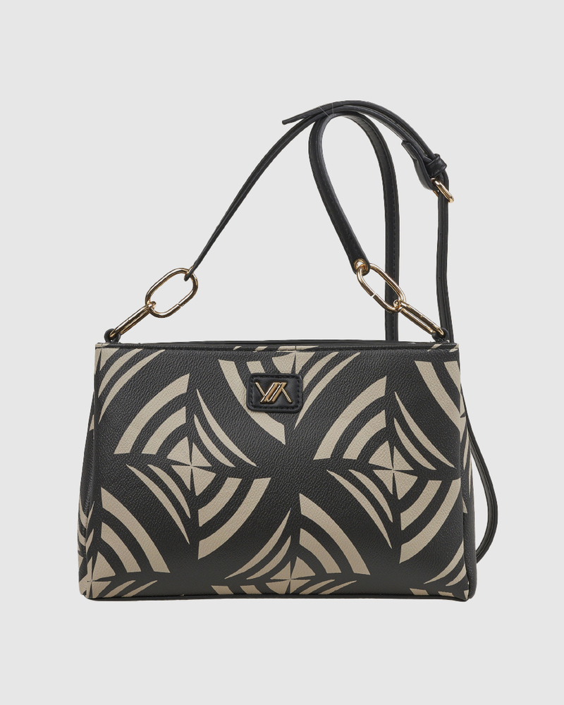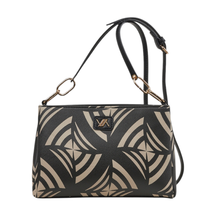 Τσάντα κατασκευασμένη από συνθετικό δέρμα μεδομημένο σχήμα που προσφέρει κομψότητα και πρακτικότητα στην καθημερινή χρήση.Διαθέτει μοντέρνο μοτίβο στο εξωτερικό και ρυθμιζόμενο λουράκι ώμου για άνετημεταφορά. Το εσωτερικό είναι ευρύχωρο και οργανωμένο με πολλαπλές θήκες καικεντρικά διαχωριστικά με φερμουάρ για ασφαλή αποθήκευση προσωπικώναντικειμένων. Το μεταλλικό διακοσμητικό στοιχείο στο μπροστινό μέροςολοκληρώνει τον σύγχρονο σχεδιασμό της. Συνοδεύεται απο προστατευτική θήκη.